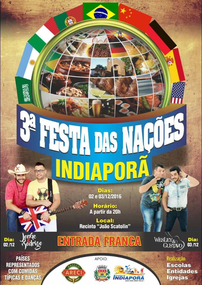 Festa das Nações em Indiaporã é realizado anualmente no ínicio do mês de dezembro com barracas montadas pelas entidades, escolas e igrejas que oferecem comidas típicas de diversos países, além de apresentações de danças típicas e shows artísticos.