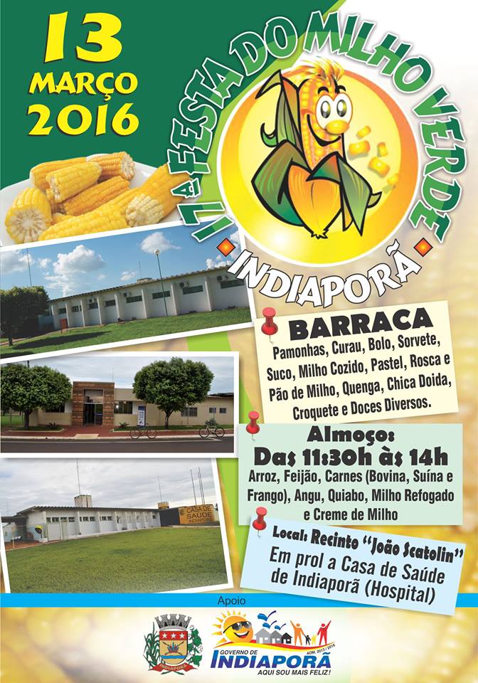 Evento realizado no mês de março, no Recinto João Scatolin, em Indiaporã. A Festa do Milho Verde é composta de um almoço com comidas caipira e paralelamente são encontradas várias barracas onde é vendido diversos doces, salgados e sobremesas feitas de milho verde. A renda era destinada a construção da igreja matriz e atualmente é dividida com a Associação Casa de Saúde de Indiaporã.