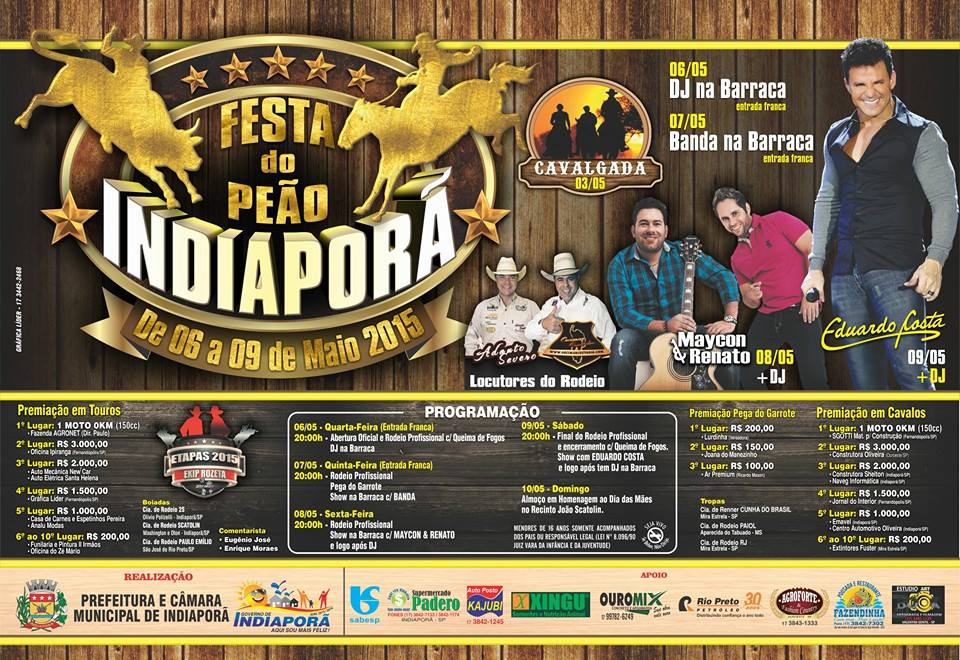 A Festa do Peão Boiadeiro de Indiaporã ocorre todos os anos na ocasião da passagem da comemoração do aniversário de emancipação política do município, na semana do dia 12 de maio. Câmara Municipal de Indiaporã.