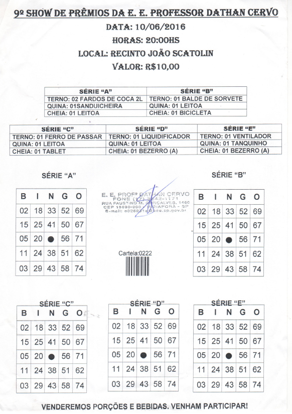 Show de prêmios da Escola Estadual Prof. Dathan Cervo de Indiaporã é realizado anualmente no mês de JUNHO pela APM da Escola para arrecadar recursos financeiros que auxiliam na manutenção predial e das atividades escolares.