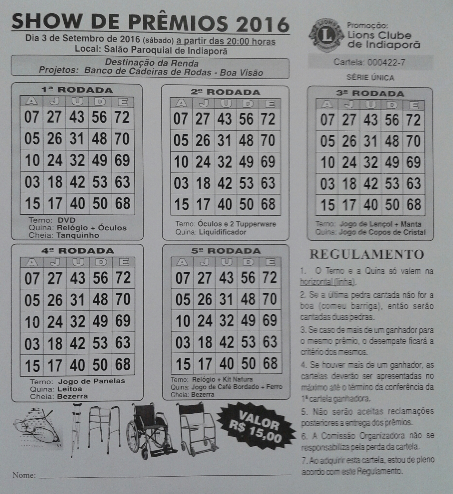 Show de Prêmios do Lions Clube de Indiaporã acontece tradicionalmente no mês de setembro de cada ano, objetivando arrecadar recursos para projetos de cadeiras de rodas e boa visão