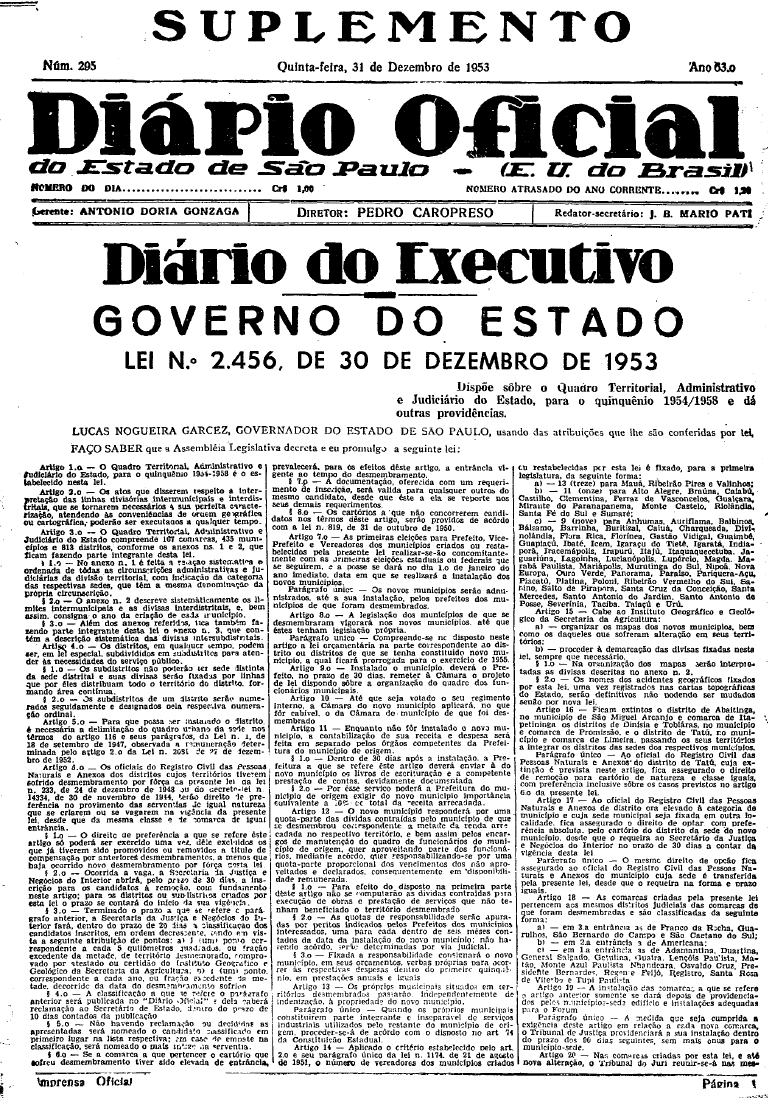 Foto da página do jornal Diário Oficial do Estado de São Paulo do dia 31 de dezembro de 1953, publicando a Lei nº 2456 de 30/12/1953 que cria o município Indiaporã, no seu Artigo 14, Letra C. Câmara Municipal de Indiaporã.